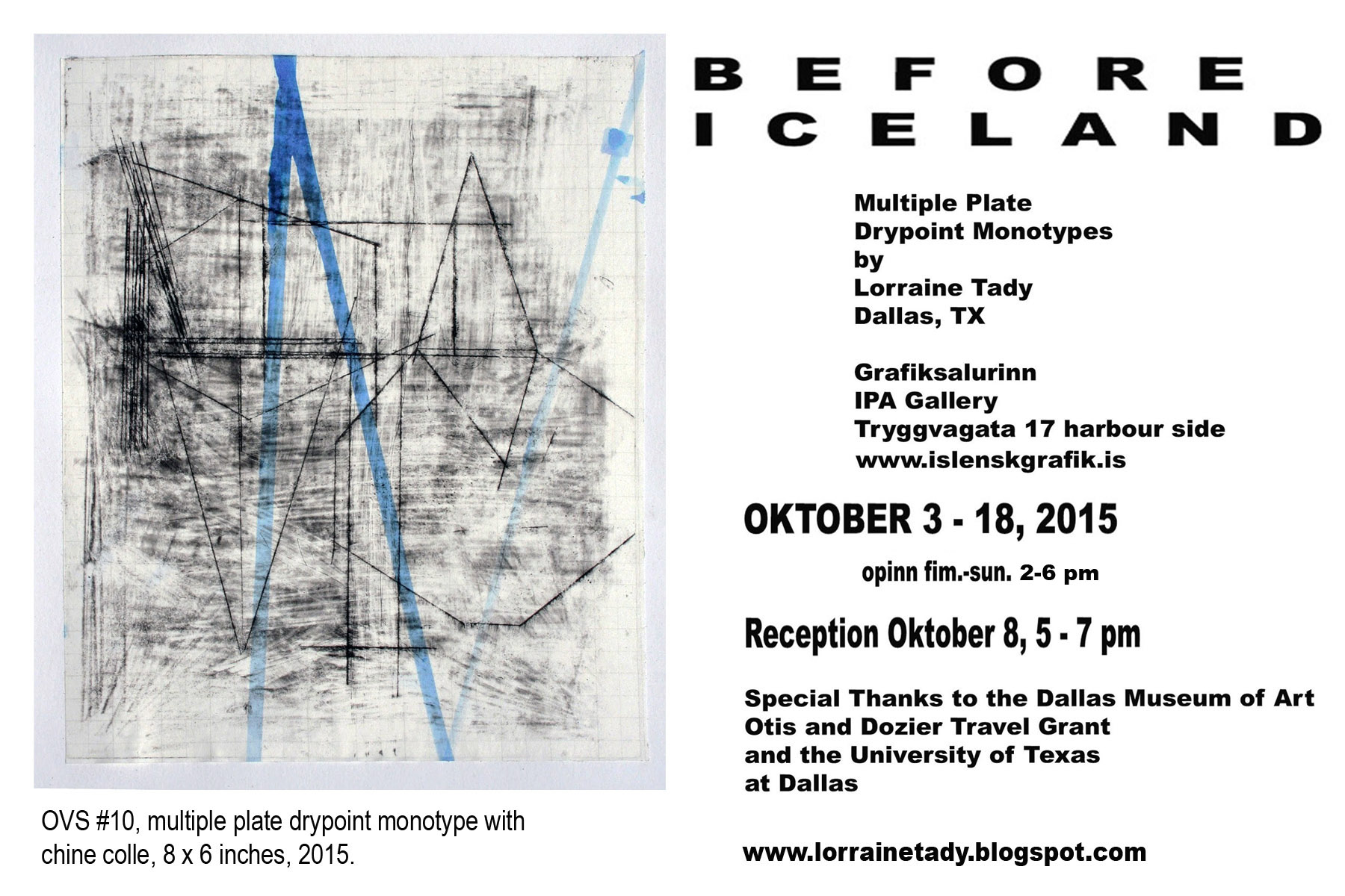 Á sýningunni “Before Iceland” sýnir hún 33 einþrykk unnin í þurrnál með chine collage og segir um verkin að hún líti á grafík sem eina aðferð við teikningu frekar en prentmiðil eða: