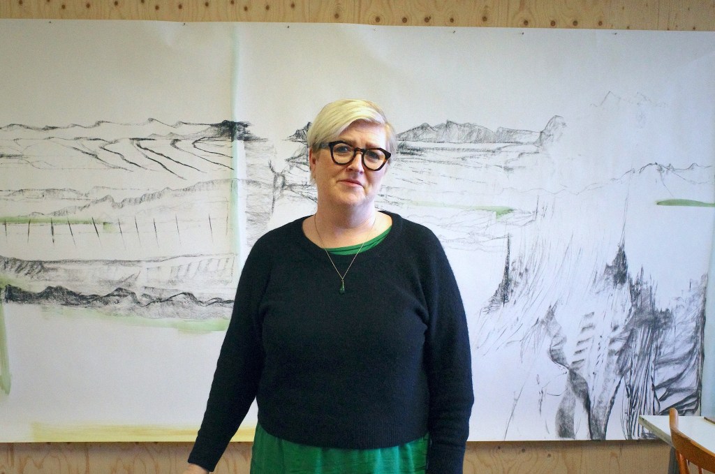 Á sýningunni eru stórar teikningar og verk á pappír og viðfangsefnið er staður á Suðurlandi sem er henni persónulega kær og hefur verið innblástur að ýmsum verkum gegnum tíðina. Hvað er þar? Kannski einhver óljós þráður? Glitofin perla upplifana og skynjunar í fylgsnum hugans sem hún