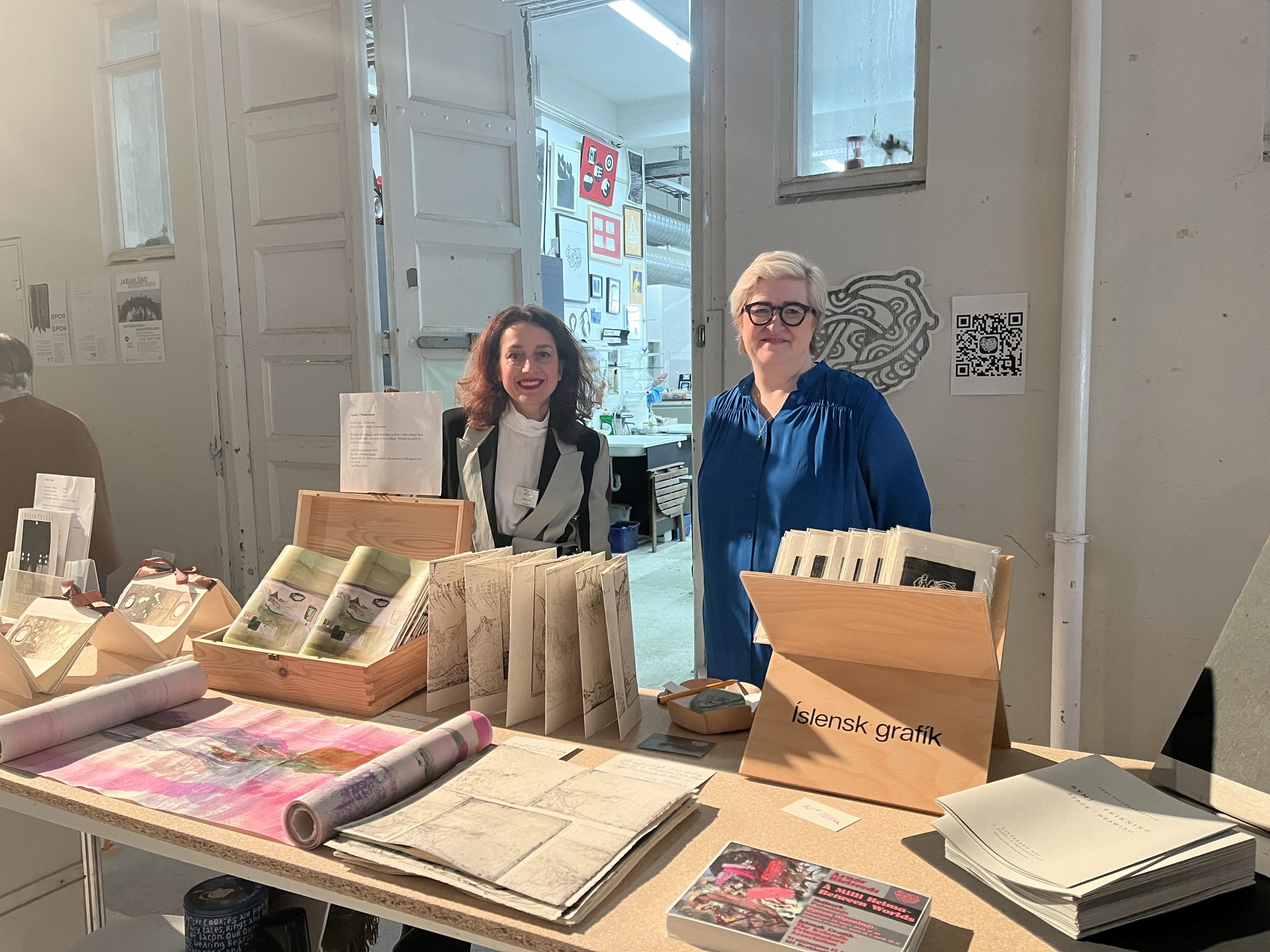 Soffía Sæmundsdóttir og Emilia von Telese stóðu vaktina ásamt því að Þóra Sigurðardóttir, myndlistarmaður, bauð í listamannaspjall á verkstæði íslenskrar grafíkur.