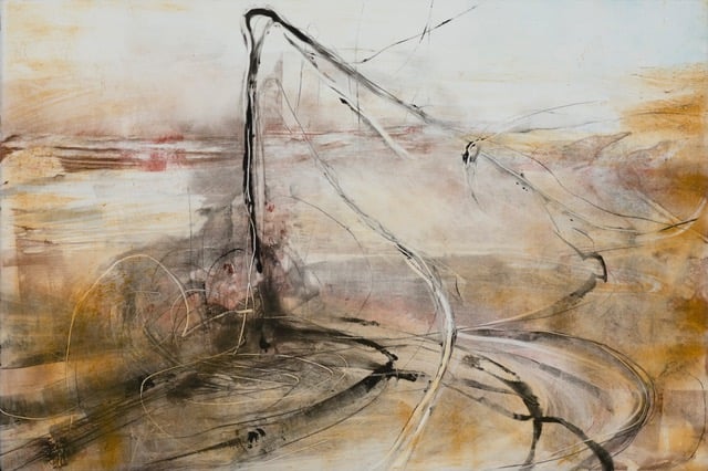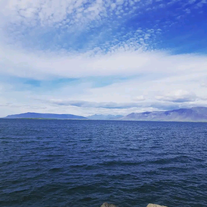 “Skýjafar fjærst eins og kyrrt ljósflökt að kvöldi eða að morgni. Sjóndeildarhringur þverlína yfir myndflötinn og honum fylgt eftir með löngum djúpum þveröldum, eða meira eins og sjórinn andi stórum löngum djúpum andardrætti og renni saman við hugmynd um tíbránna. Þegar framar dregur í myndflötinn breytist sjórinn í létt leikandi öldur og öldugjálfur og grípur í sig skýjaflöktið. Svo steinvölur á strönd.