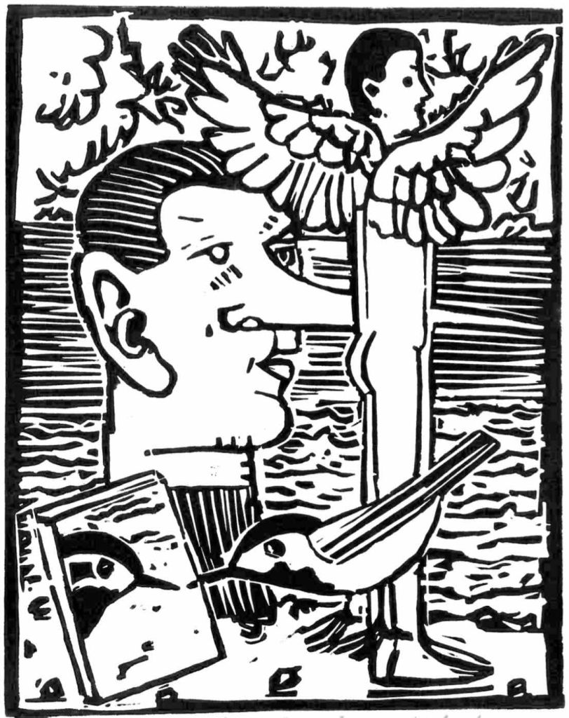 Vængirnir endurtaka form aldanna og efniskennd skýjanna og fljúga eins og ljósið og hár sundmannsins fylgir langljóslínum djúpaldanna og blekkingu tíbrárinnar. Nefið fylgir öldunum líka eftir og hverfur í tíbránna og langlínurnar sem gera einskonar spé spegilmynd og styður þannig sjónhverfinguna. Maríuerla speglar sjálfa sig og er með gogg í gogg og er nálægðin og fjarlægðin. Skuggi sundmannsins er þverlínur á heildarmyndina. Sundmaðurinn fer eitthvað. Vængjamaðurinn er draumur. Maríuerlan veltir fyrir sér hvort spegilmyndin sé hún sjálf.” HÞF