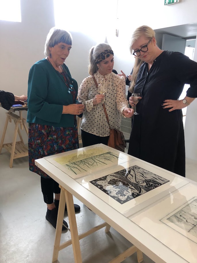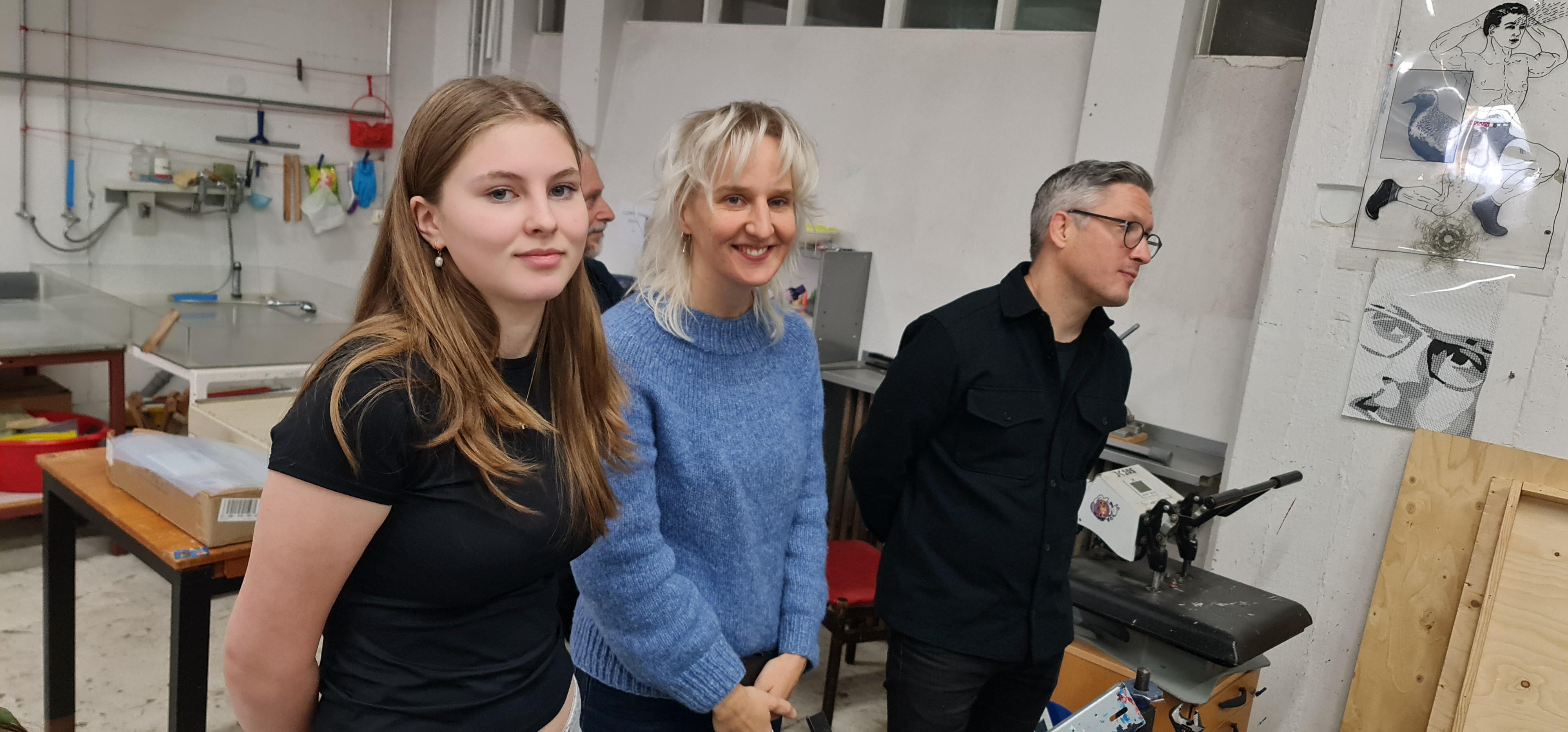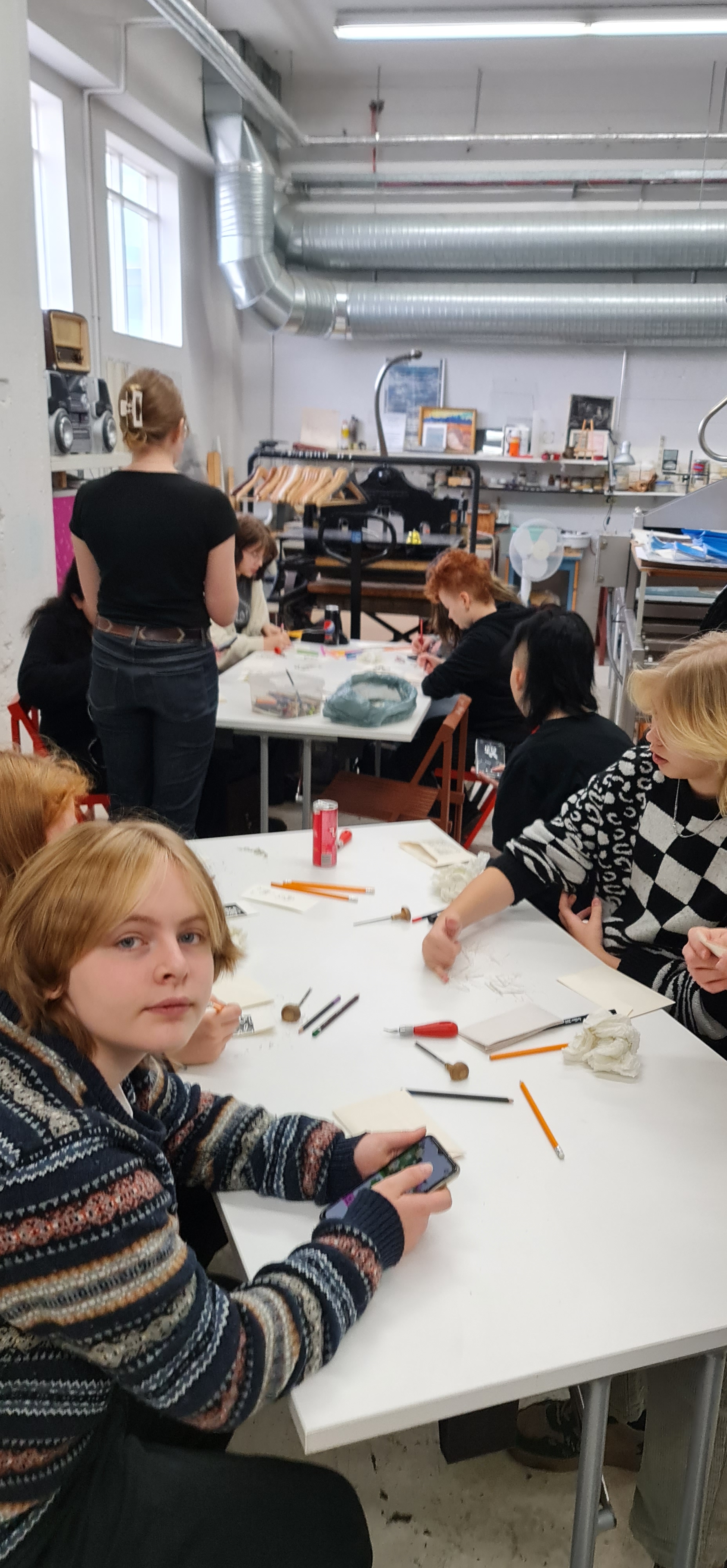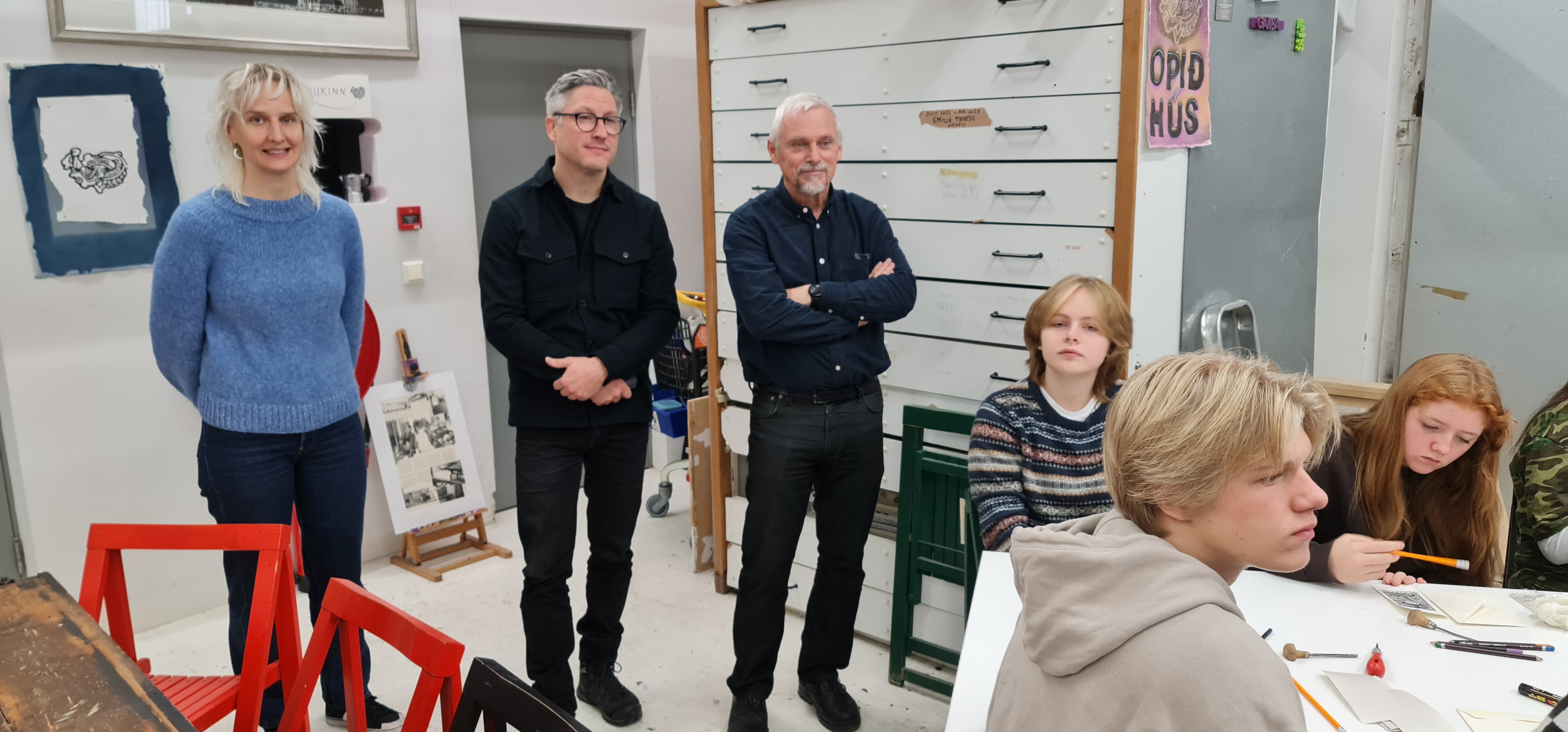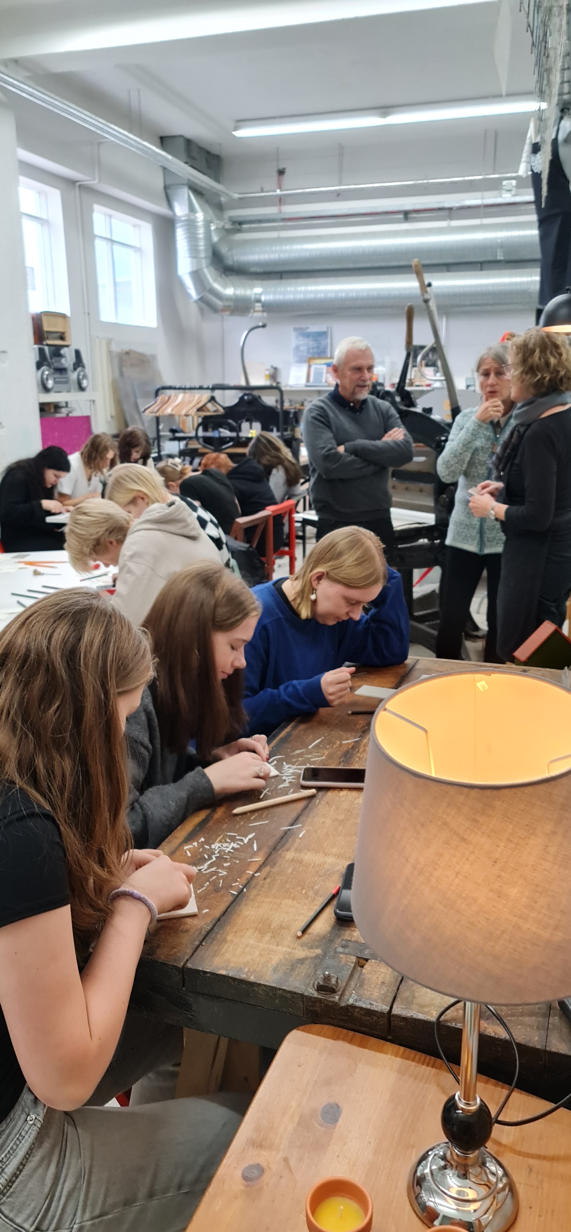 Við fengum skemmtilega heimsókn á verkstæði Íslenskrar grafíkur í morgun. Hópur 15 ungmenna og ráðgjafar þeirra frá Piteå í Svíþjóð. Þau munu sýna í Kviku, Menningarhúsi Grindavíkur á sama tíma og Solander sýningin stendur þar yfir.Þau fengu að kynnast dúkristu og fylgdust með þegar listamaðurinn Atli Bender var að þrykkja silkiþrykk.
