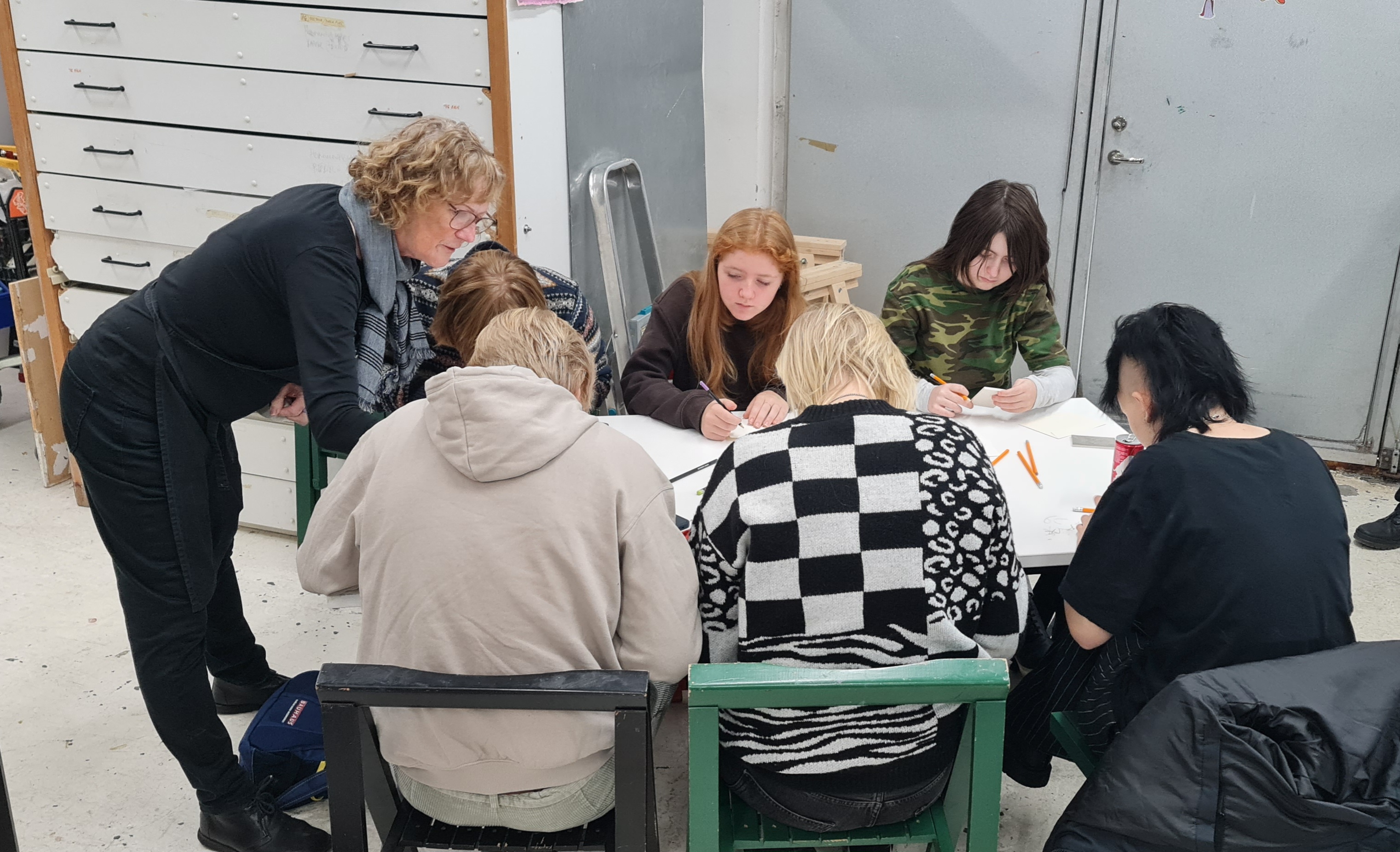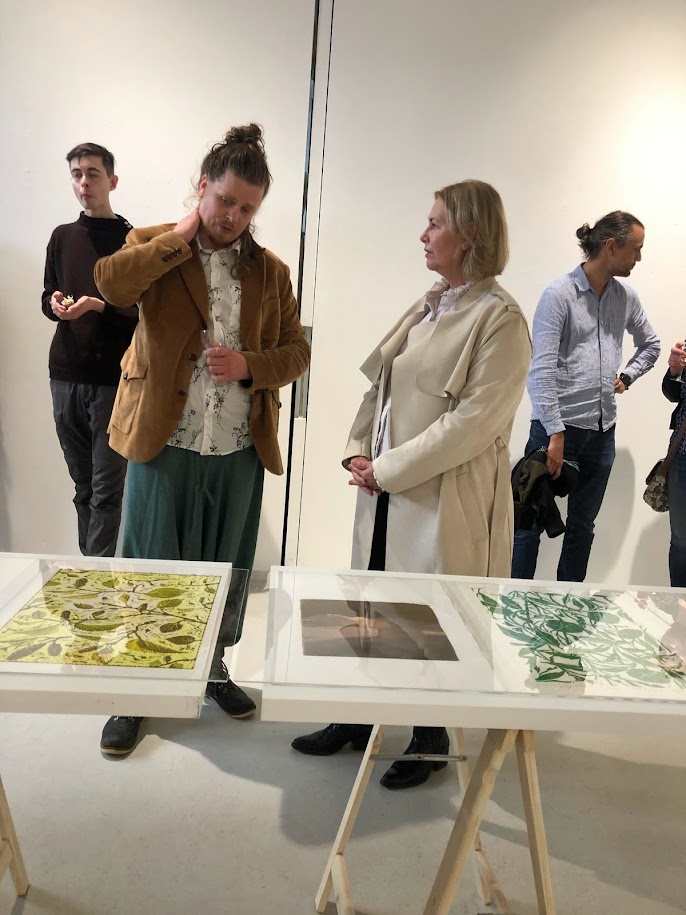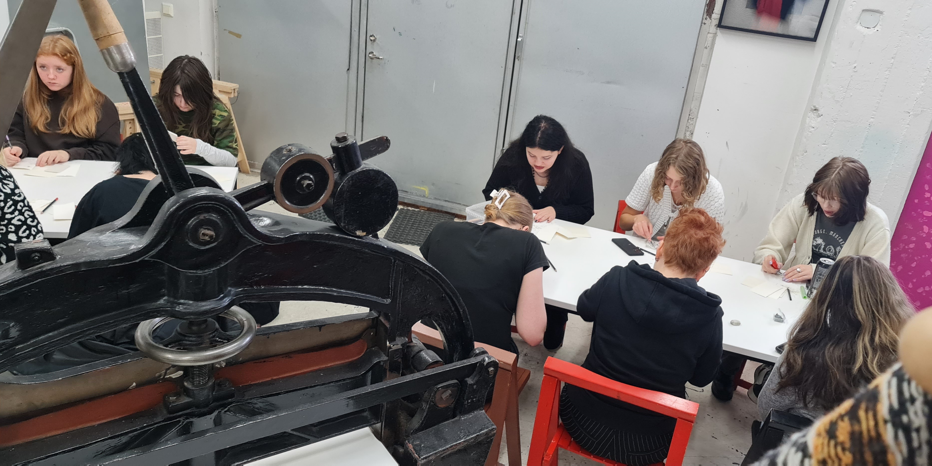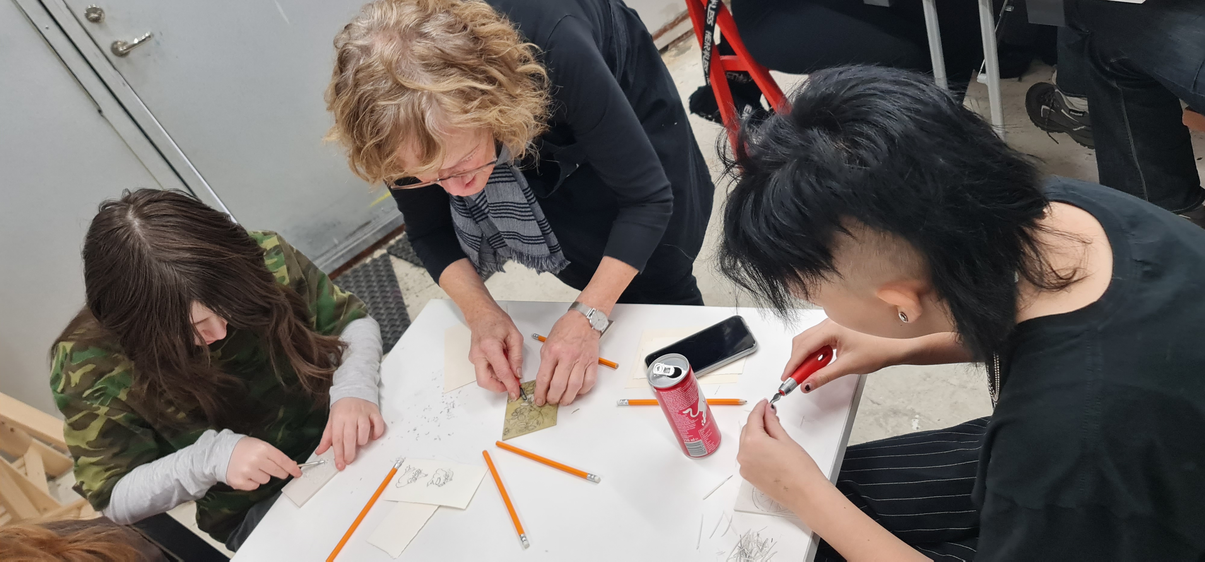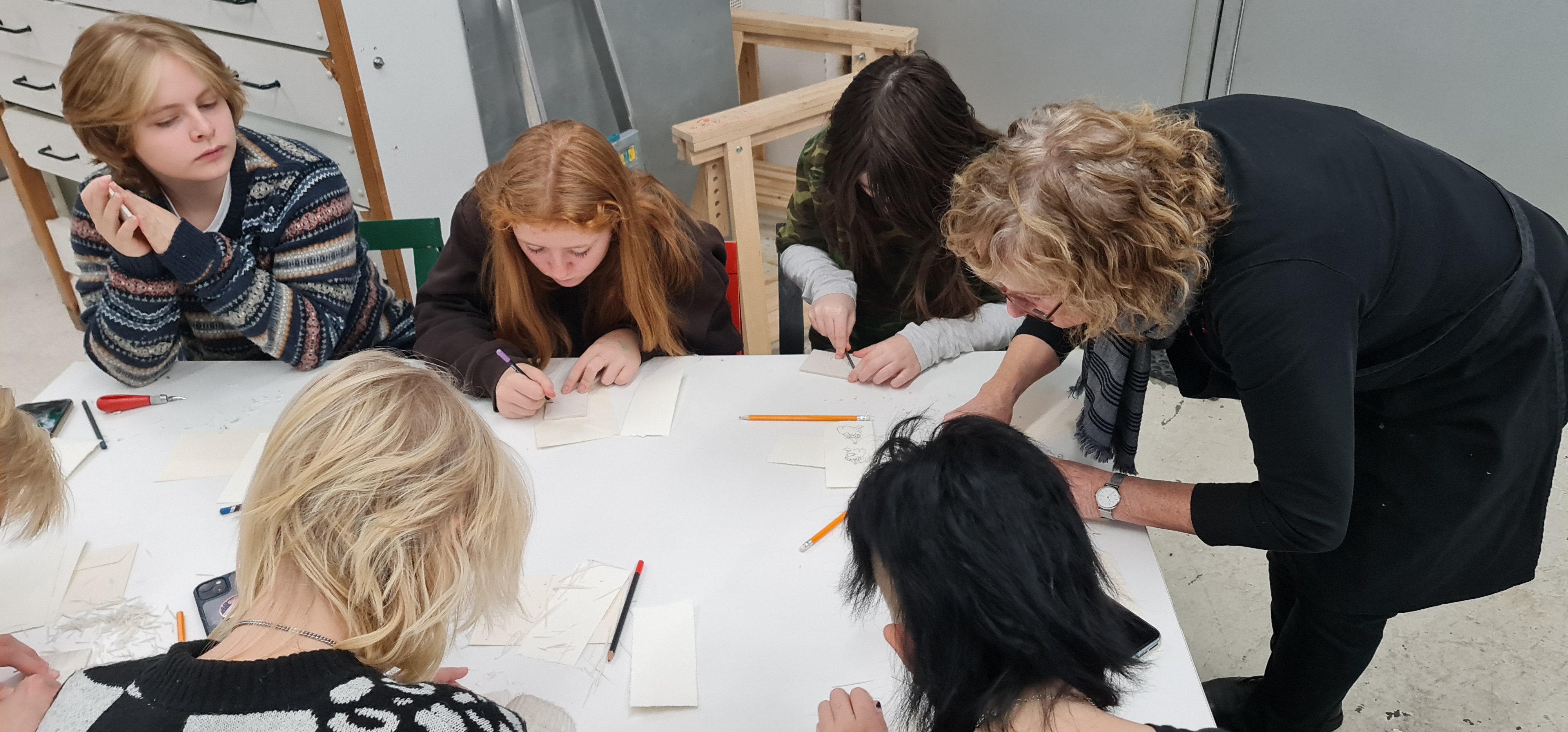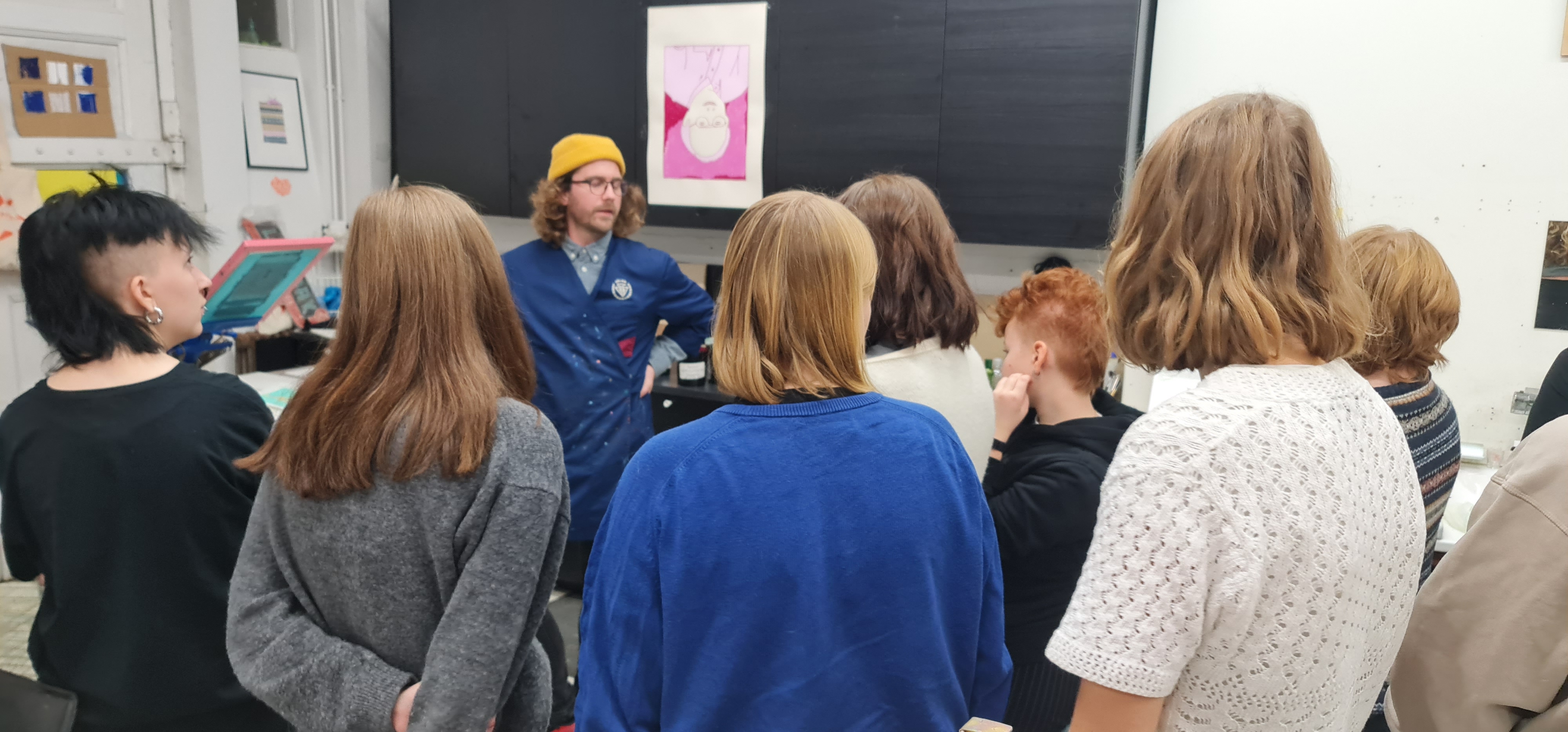 Við fengum skemmtilega heimsókn á verkstæði Íslenskrar grafíkur í morgun. Hópur 15 ungmenna og ráðgjafar þeirra frá Piteå í Svíþjóð. Þau munu sýna í Kviku, Menningarhúsi Grindavíkur á sama tíma og Solander sýningin stendur þar yfir.Þau fengu að kynnast dúkristu og fylgdust með þegar listamaðurinn Atli Bender var að þrykkja silkiþrykk.